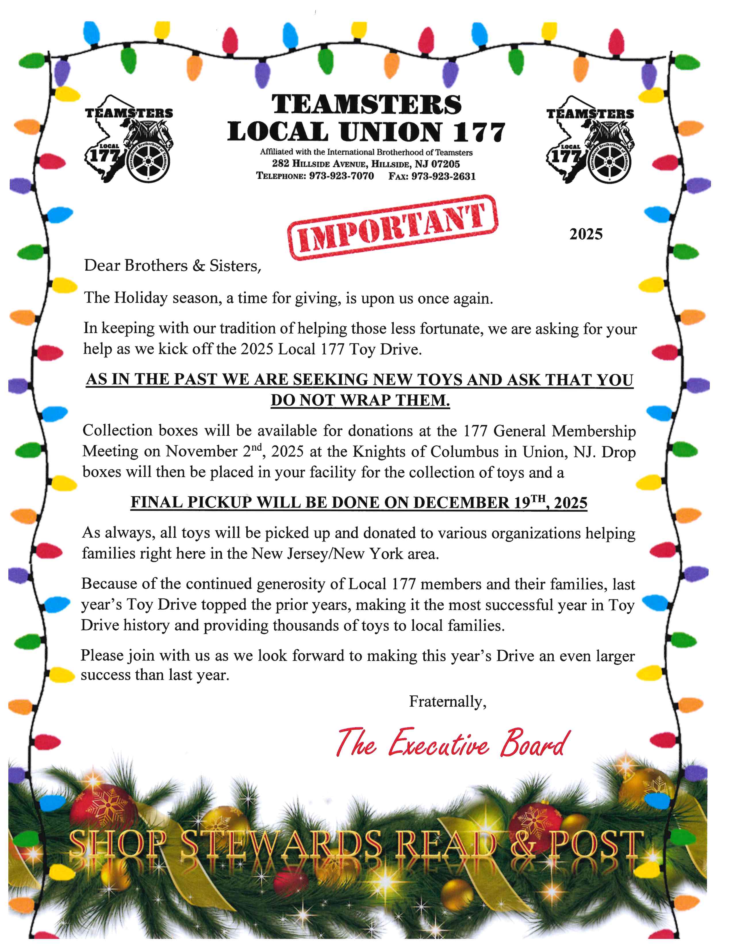 We would like to wish our members and their families a very happy and healthy New Year. Back in early November 2024 a letter was sent to our stewards and posted on our union boards announcing the kick-off of the Local 177 Annual Holiday Toy Drive. We are pleased to report, that because of the extreme generosity of our members, this year's donations rivaled those of our prior years and continue to spread that generosity to much-needed families. These toys were distributed to multiple organizations right here in the New York / New Jersey area, providing holiday joy and happiness to countless kids and their families. Thank you to all of our members who continue to make this Toy Drive the success it is.
